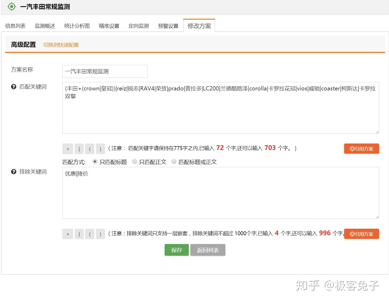 2018年我接触了很多舆情公司,主要原因还是因为想合作拿单或者代理他们的产品,也正因为如此,对一些基础功能和数据情况的对比感受会更明显,到了年底最后几天了,着手一些总结性的文章,于是就写出了本文。 首先舆情产品的狭义,大体来说是基于舆论情报的分析,提供决策支持。其中舆论的部分比较重,因为传统舆情产品主要是对网络舆论的监测、预警、报告三项核心服务。如果说广义的舆情,其实就是情报,从网络的任何细小角落里发现蛛丝马迹,推导出可以提供决策支持的信息、情报、知识、结论等等。 所以,如果单指传统舆情产品,大都包含以下核心功能: 今年,传统舆情产品大都开始加入了一些更细致的功能,一方面是因为传统产品同质化情况过于严重,另一方面也是因为现阶段如果只做政府舆情已经市场比较饱和了,但是突破到企业市场的时候,就不是这么简单了。首先企业对舆情的本质需求偏低,这里通常细分成口碑舆情、品牌舆情、高管舆情等,也就是说只有部分有实力的公司愿意购买舆情系统,一般公司很可能不愿意付出多少代价来采购舆情系统。而且很多公关公司包揽了舆情产品的功能及作用,所以如果真要说的话,那就是所有的公司大都只想买个服务,并不是非要买个系统然后自己的运营人员还得学习怎么用。 那么问题就来了,既然买的是服务,服务的可能性是远大于舆情系统自身的,服务里面有人工的作用,所以人工可以判断一些情况,包括报告、预警、引导处置等等。但是舆情系统则需要负责的设定,包括关键词组合、预警条件组合、引导处置语料配置等等。这些设置的繁琐程度,如果是没接触过舆情系统的,尤其是“懒惰”的体系内人员的话,估计只有甩脸和骂街的份,只有积累了一定规则和词库的组织才能比较好的用起来,否则大都需要商务、运营人员介入帮助客户来配置。 为什么舆情系统的配置一直是大家诟病而且更倾向于买个服务“全包”呢?这就要从关键词规则配置说起了,目前市面上大多数系统都有一些通用的配置方法,比如: 上图是凡闻的方法,基本策略是,包含全部(and关系),包含任意(or关系)和排除(not,and关系),也就是说(a and b and c) and (d or e or f) not (g and h and i),但是这样的配置实际上是一个非常简化的配制方法,很多细项功能是无法实现的。 上图是舆情通的方案配置方法,第一层是匹配,第二层是排除,每个都支持基础布尔表达式,包括:括号、与(+号,表示and)、或(|号,表示or),这样就可以做一些更复杂的组合。同时这里允许选择该表达式生效区域是标题还是正文还是全部。 上图是Meltwater的高阶布尔表达式搜索框,关键词配置监测任务也是一样的操作。这个布尔表达式的检索逻辑以及可控制的维度可以说是比较全面的,其他公司的基本类似,包括百分点舆情、智慧星光、清博舆情、慧科等等,大都只是他们的变种或者增加了一些维度,殊途同归。这个布尔表达式可以多复杂呢?见下图说明。 也就是说,Meltwater的布尔表达式不仅具备了与或非关系,还支持标题匹配、逻辑顺序、模糊匹配、位置关系等细分功能。但是看到这么多配置方法,再加上舆情中可能出现的词千变万化,每次检索出来的数据还要大海捞针找到有价值的线索,这种工作实在不是一般人能享受过程的,所以所有市面上的舆情系统都无时不刻的在被诟病。 近年来,舆情公司应对这种客户的诟病的方法不外乎几种,一,由公司安排运营人员、商务人员协助配置甚至直接帮助配置关键词规则;二,直接购买服务,全部操作都由运营人员操作,客户只需要提出需求便可。至于简化配置方法的第三条路,也就是规则库或者词库一直因为客户的跨行业、跨地域区别太大,导致停留在摸索期。积累了大量用户操作行为之后,一些公司已经开始将词库进行模型训练并建立基于深度学习技术的文本分类模型,用于舆情的下一代功能改进,比如某公司舆情分类模型已经至少可以看到二级,且覆盖较全面。 我个人认为以后可以预见到,关键词配置会进入辅助阶段,而已经训练好的模型会进入主流,只要勾选便可以直接使用,并且还可以通过用户行为不停地优化,最终甚至引入更复杂的推荐引擎,将找到线索的可能性以及用户体验大幅度改进。这也是2018年舆情系统的一个重要的改进方向。 另一个比较重要的舆情系统改进方向是加强了监测类型,传统监测类型是关键词自定义监测任务、专题监测任务、事件监测任务,现在则是开始加入更精细化的人物监测任务、传播监测任务等等。 人物监测一直是一个老生常谈的监测类型,一方面因为涉及个人,有一定的隐私问题,所以尽可能不跨越那条线,主要面对公众知名人物的正面形象问题进行把控。另一方面人物监测的方法一直是一个头疼的事情,首先人名是不靠谱的,重名可能性很高;其次是人作为一个实体,具备很多属性,包括出生地、居住地、现时活跃地都可能不同,职位可以有多个,身份也可以有多个,别名和昵称都可以有多个,这是互联网的天然优势所在,但是导致的结果就是监测的时候会比较麻烦,准确率和召回率都会成为问题。解决方案就是通过NLP,对每个文章中的人名识别,人名最近距离的描述句法进行识别,找出描述词-分析词性-识别组织机构、职位-企业库内验证,最终识别出要监测的人物对象是否在这篇文章中,是否是本文的主要内容主体等